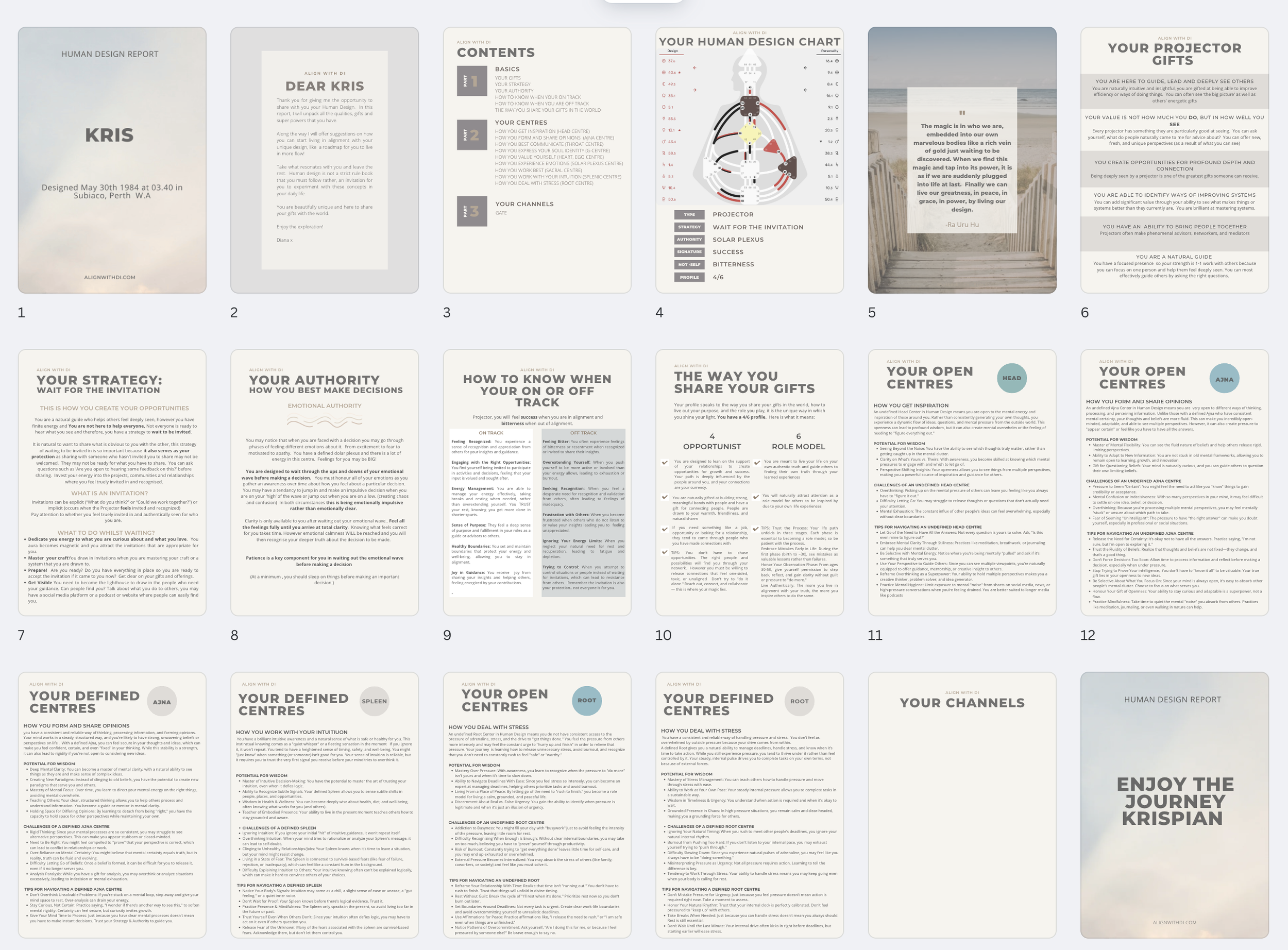 A full exploration of your type, strategy, authority, open/defined centres, gifts soul lessons, and life purpose — plus your own beautiful PDF to reflect on.